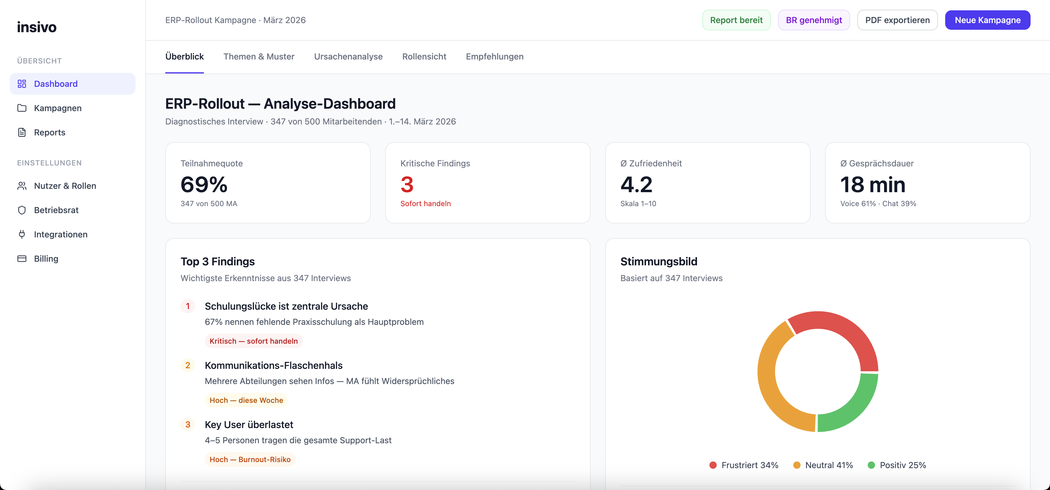Klassische Surveys messen Stimmung. Insivo versteht Ursachen. Statt Multiple-Choice-Antworten führt unsere KI echte adaptive Gespräche: Sie hört zu, stellt Nachfragen und erkennt Muster über hunderte Interviews gleichzeitig. Das Ergebnis ist kein Stimmungsbarometer, sondern eine strukturierte Root-Cause-Analyse. Direkt präsentierbar für die Geschäftsführung.