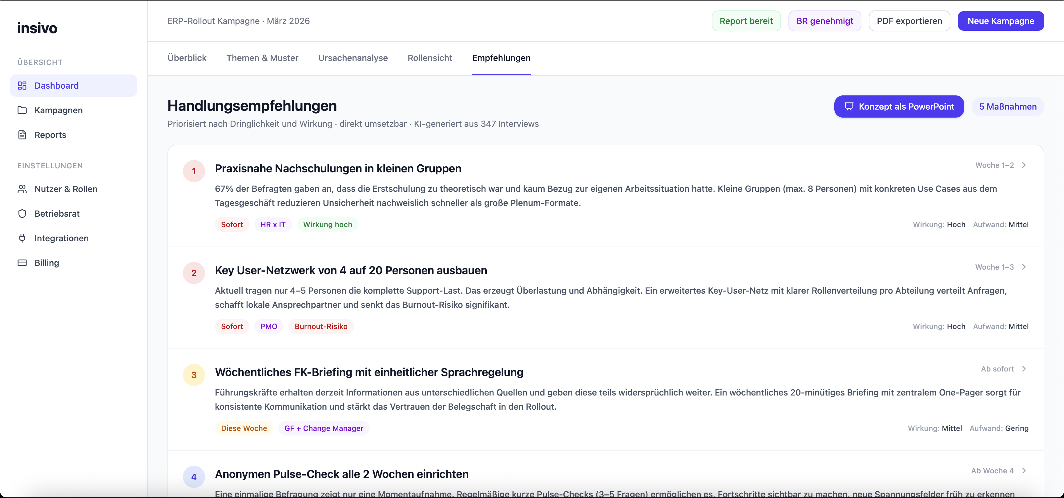 Vor dem Start einer Kampagne erhält der Betriebsrat ein vollständiges Paket: alle Kernfragen, die methodische Beschreibung der KI-Logik, das Anonymitätskonzept und den DSGVO-Nachweis als exportierbares PDF. Die Kampagne startet technisch erst nach dokumentierter BR-Freigabe. Das ist kein UI-Hinweis, sondern ein hartes technisches Lock. Änderungen am Fragebogen nach BR-Ablehnung sind möglich. Das System generiert automatisch ein aktualisiertes Paket.
